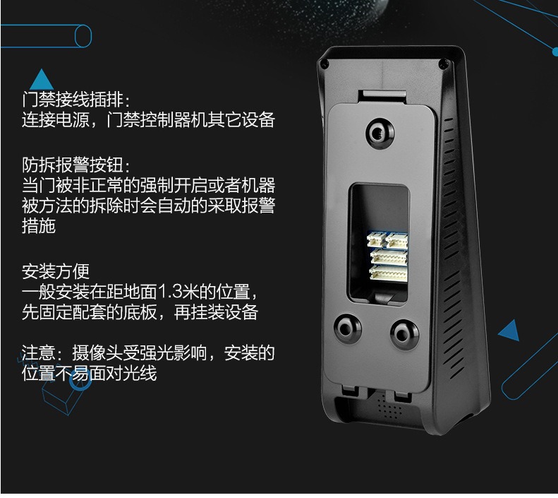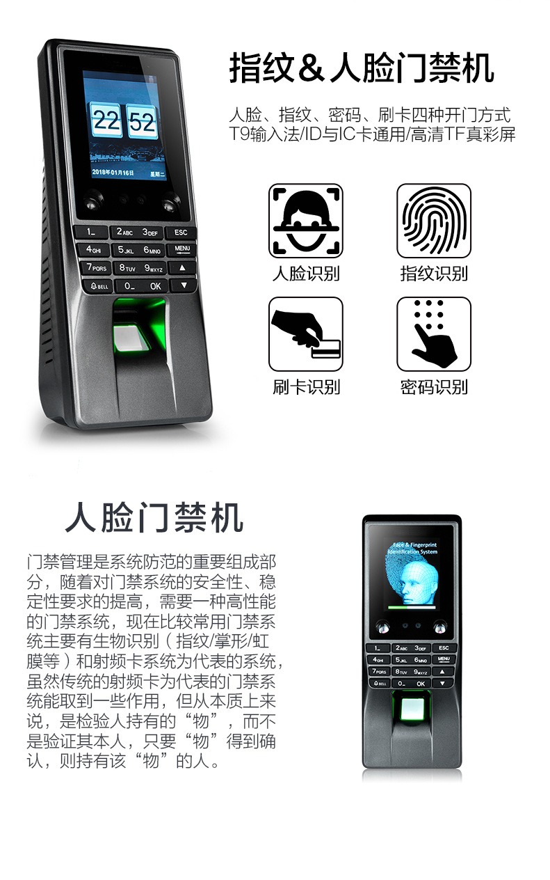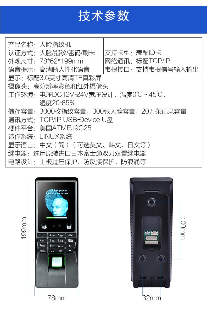 指纹容量 3000ID卡容量 1000记录容量 200000识别方式 指纹, 密码对比方式 1:N,1:1指纹识别速度 0.7s误判率 ≤0.0001%拒真率 ≤0.01%通讯方式 USB2.0 免驱动,TCP/IP,BS操作系统 Linux按键 4*4 键机器尺寸 190x80x30mm主芯片 Atmel 9G25报警功能 胁迫报警、防拆报警、强制开门报警 开门超时报警、输入点报警门锁输出 常开