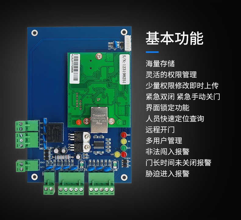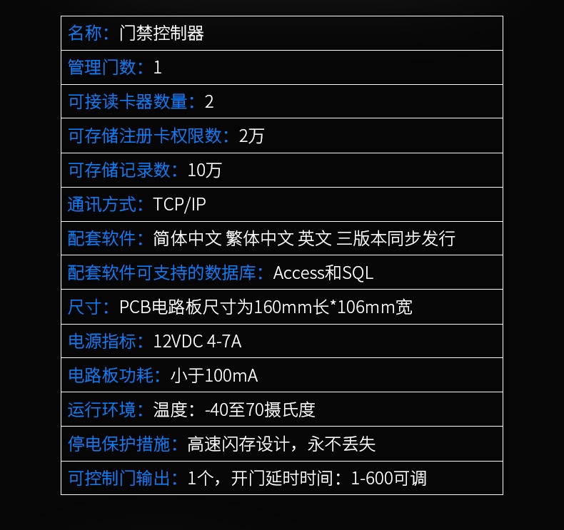 ◆ 32位ARM嵌入式工业级门禁控制器◆ 环境温度: 建议在-35℃~65℃范围内◆ 功 耗: 100mA左右(不带负载的情况下)◆ 通讯方式: TCP/IP(默认100M)◆ 用户注册卡数量:4万 ◆ 脱机保存记录数量:10万◆ 读卡器输入格式: wg26~40 bit◆ 可控制门输出: 单门[1个] 双门[2个] 四门[4个]◆ 可接读卡器数量: 单门[1对] 双门[2对] 四门[4个]