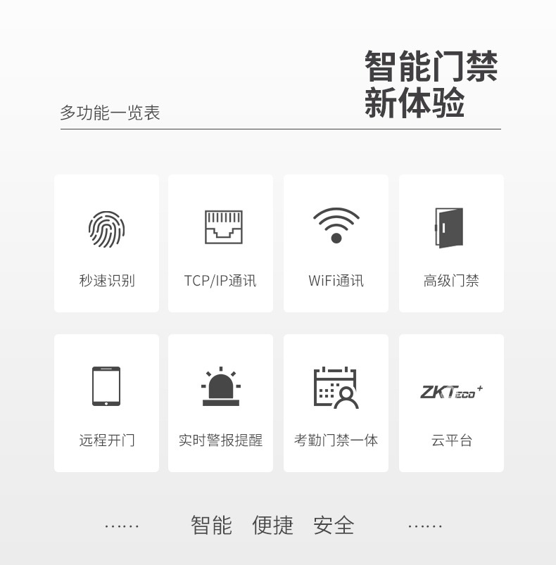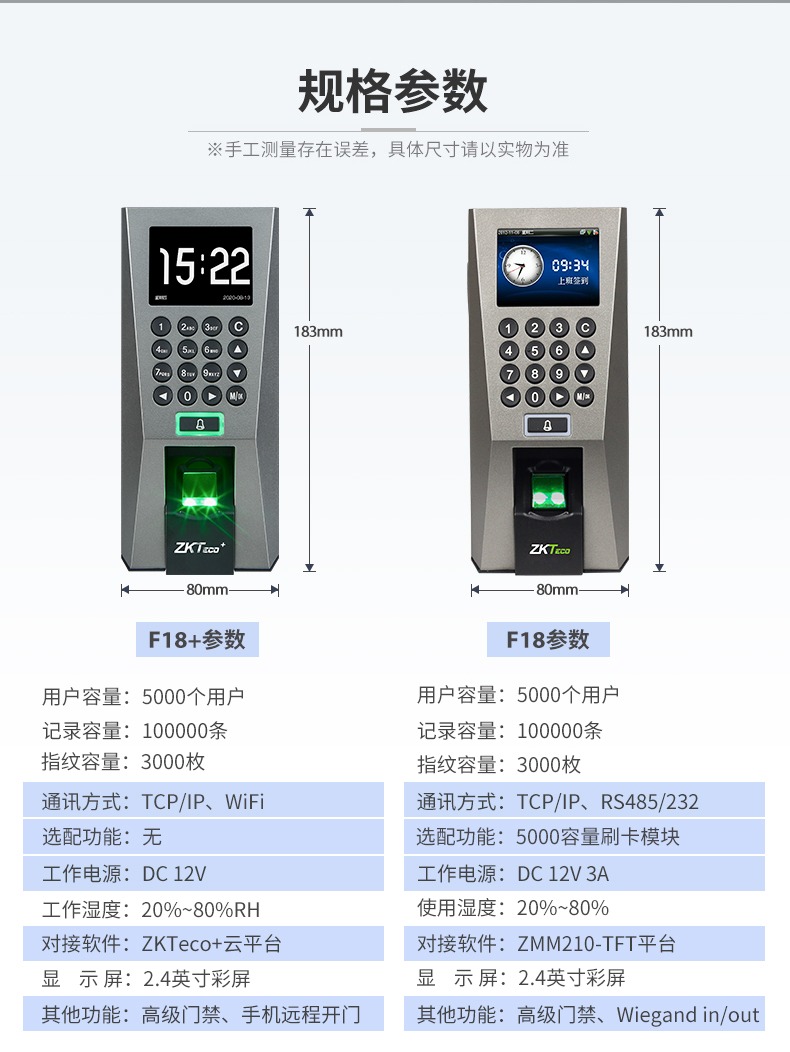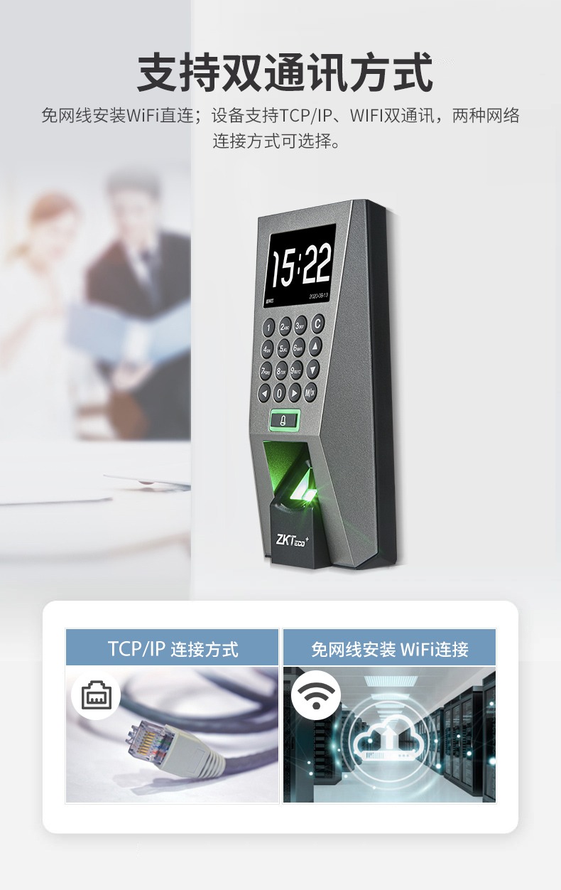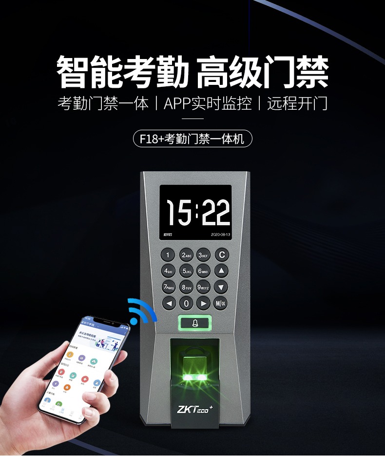 F18运行于ZMM210-TFT平台,CPU主频达1.0Ghz,硬件平台速度更快,且优化指纹识别速度、固件性能;延续此前的经典。该产品同时采用了熵基科技架构的固件,具备灵活的权限设置及便捷的数据管理功能等;标配TCP/IP通讯方式,支持跨网段夸网关连接,门禁功能方面支持高级门禁、Wiegand in/out等功能。